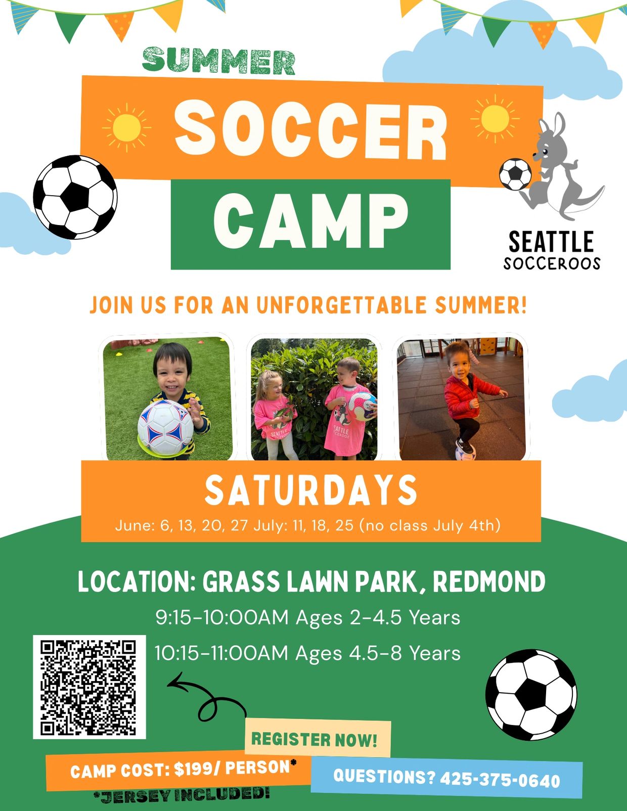 You asked, we listened! We’re so excited to bring back our Socceroos Summer Camp! Join us on Saturday mornings at Grass Lawn Park in Redmond for a fun, high-energy soccer experience designed just for young athletes.